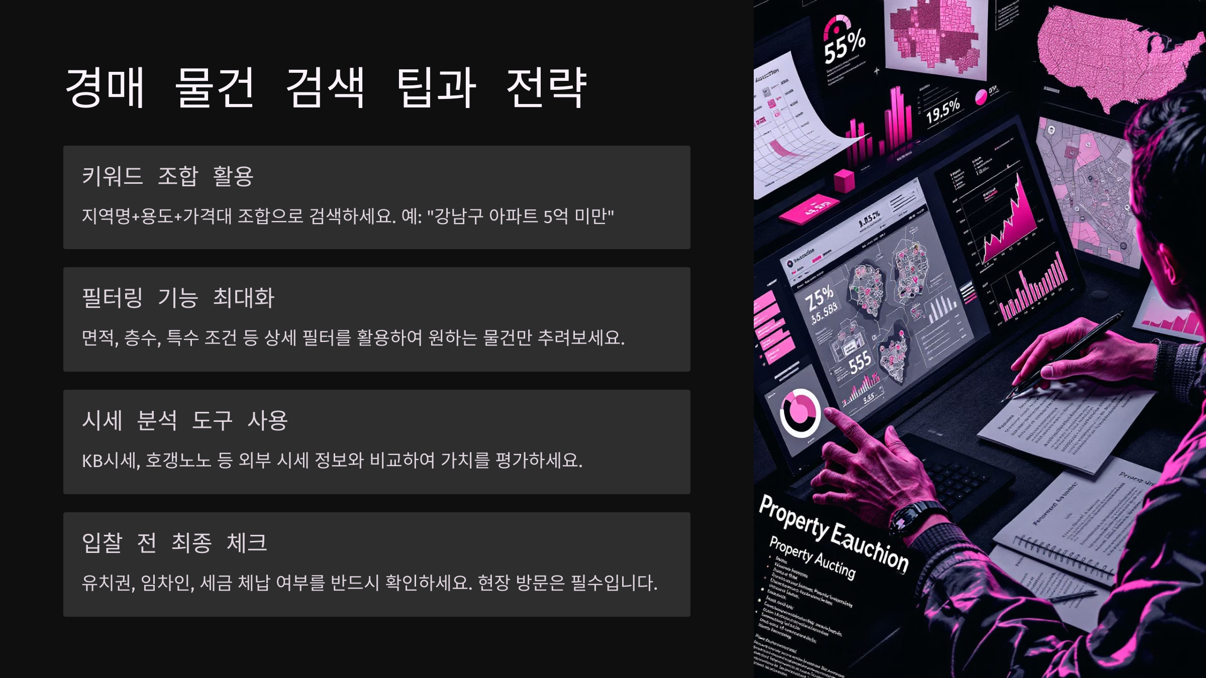 이제 실전 단계로, 경매 물건 검색 전략과 팁으로 넘어가볼게요. 어떤 필터를 쓰고, 뭘 먼저 확인해야 할지 알려드릴게요 💼