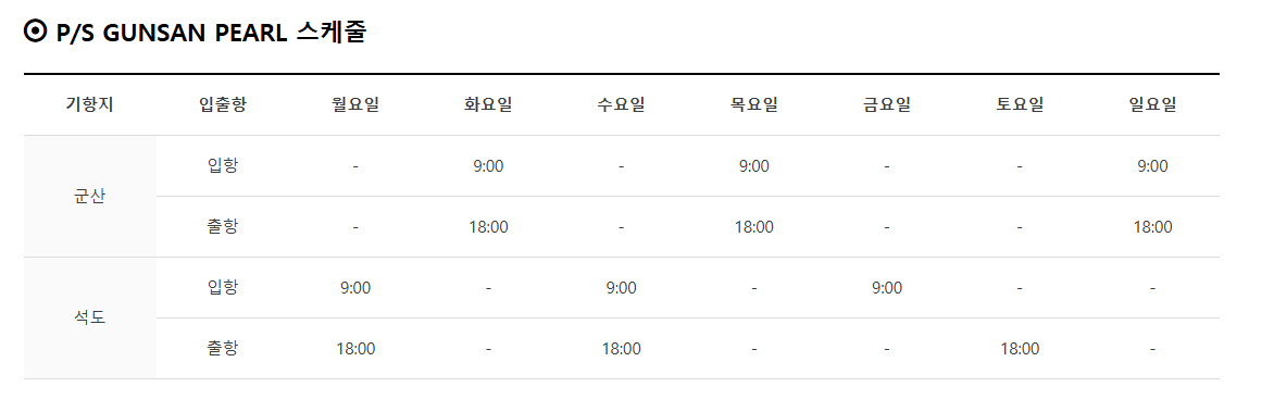 운항 스케줄은 주 2~3회이며, 군산 출항은 주로 저녁(19시~21시), 석도 출발은 오전(10시~12시)으로 배정돼요. 선박마다 일정이 조금씩 다르기 때문에 사전에 석도국제훼리 홈페이지나 여행사를 통해 정확한 시간을 확인하는 게 중요해요.