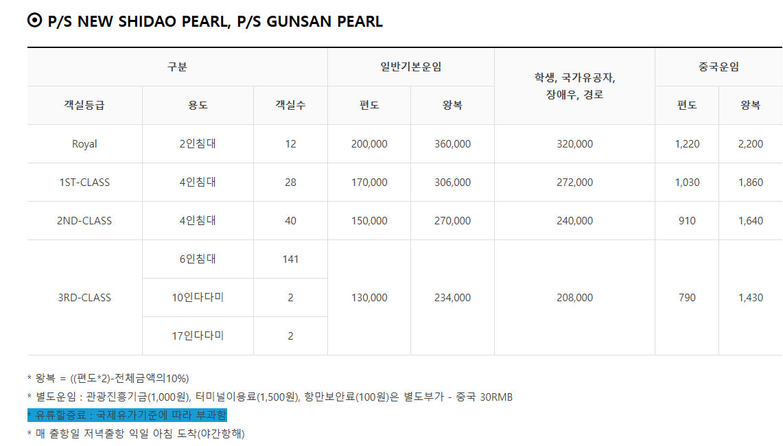 객실 유형 1인 요금(편도) 특징 비고 일반석 ₩150,000 리클라이너 좌석 가장 저렴 2인실(침대) ₩200,000 샤워실, 침대 완비 커플/가족 추천 4인실(도미토리) ₩170,000 공용 침대형 친구끼리 적합 VIP룸 ₩280,000 바다 전망, TV 프라이빗 전용 요금은 환율, 시즌, 예약일자에 따라 변동될 수 있으니, 출발 전 꼭 확인하세요! 😎