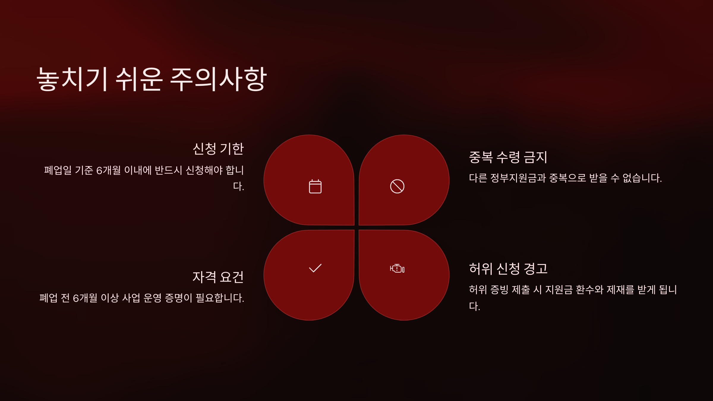 놓치기 쉬운 주의사항 무료 폐업지원금을 신청할 때, 절차도 중요하지만 ‘주의사항’을 정확히 알아두는 것도 정말 중요해요. 많은 분들이 좋은 제도가 있음에도 불구하고 작은 실수 때문에 지원금을 못 받는 경우가 많거든요.