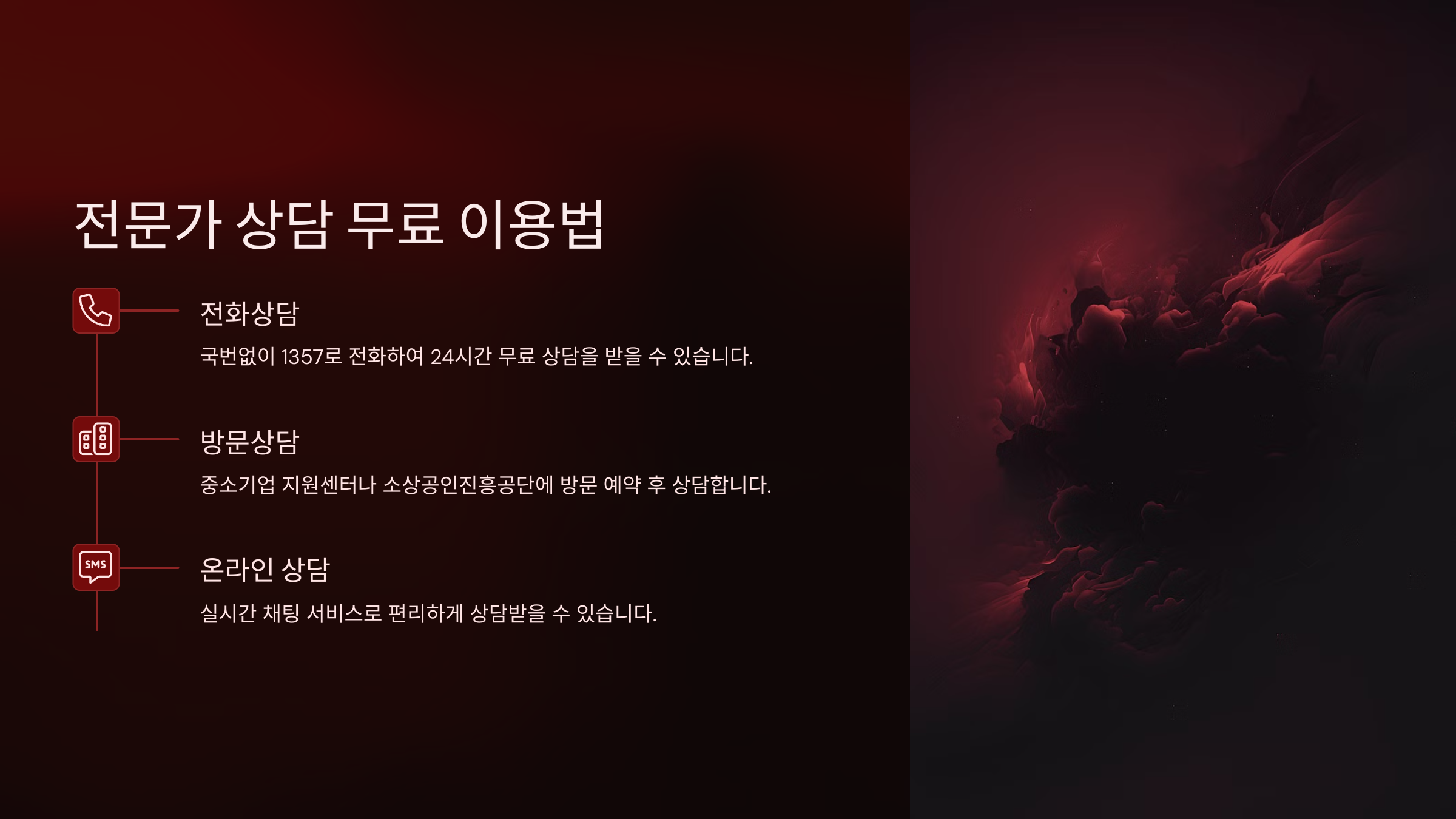예를 들어, 직원 정리 시 법적인 문제나, 점포 철거 계약 위약금 문제, 사업자등록 폐업 신고 절차 등 전문적인 조언이 필요한 순간에 전화 또는 방문 상담을 신청할 수 있어요. 이 모든 서비스가 무료예요!
