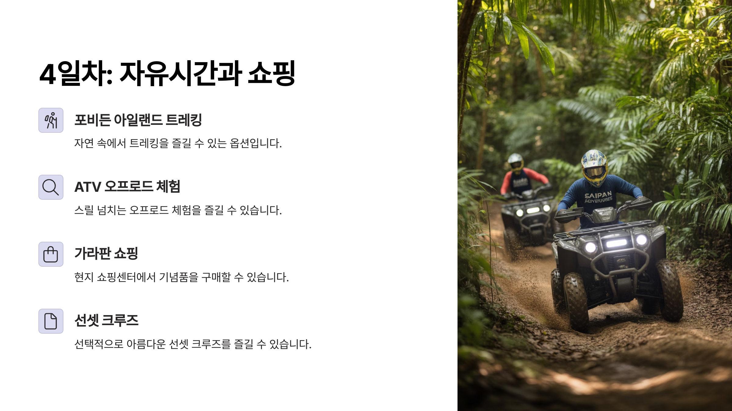 사이판 4일차: 자유시간과 쇼핑 사이판 여행의 마지막 날, 이제 조금 더 여유롭고 자유롭게 시간을 보낼 차례예요. 오늘은 자유시간을 즐기면서 쇼핑도 하고, 좋아하는 액티비티를 선택해 편안한 시간을 보내세요. 아침은 조금 늦게 시작해도 괜찮아요.