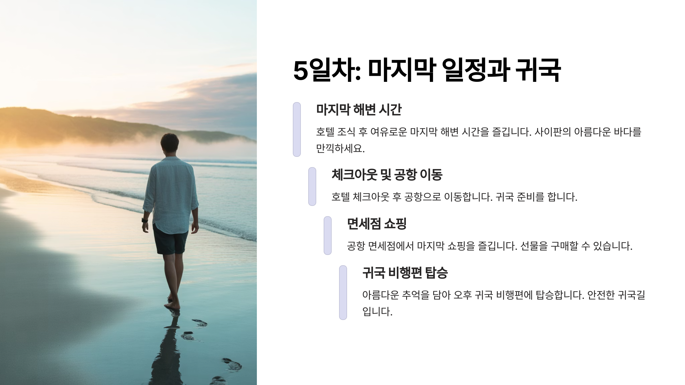 이제 사이판에서의 마지막 날이 다가왔어요. 비행시간에 맞춰서 여유 있게 일정을 마무리하고, 공항으로 떠날 준비를 해야 해요. 5일차는 주로 마지막 쇼핑과 공항으로 가는 일정을 포함해요. 아침에는 천천히 일어나서 가벼운 아침식사를 즐기세요.아침은 숙소에서 제공되는 간단한 뷔페식이나 현지 카페에서의 커피와 빵으로 시작하면 좋겠어요. 사이판에서의 마지막 시간을 즐기기 위해 가라판이나 마이크로 비치 주변을 한 번 더 산책하며, 기념 사진을 남기는 것도 좋은 아이디어예요. 오늘은 특별히 편안하게 하루를 보내고, 마음 속으로 '다시 와야지' 하는 생각을 하게 될 거예요.