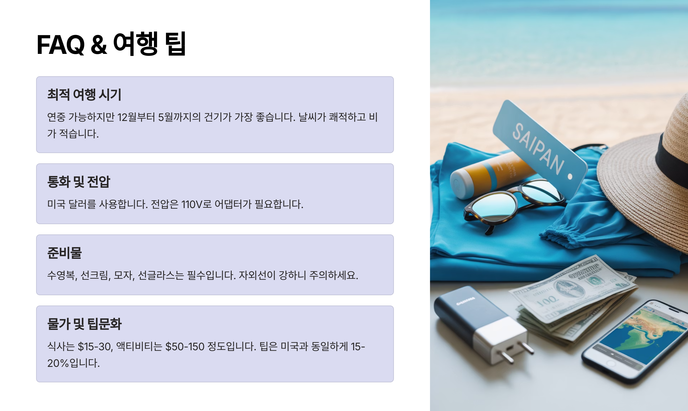 Q1. 사이판은 어떤 계절에 여행하기 좋은가요?A1. 사이판은 연중 내내 따뜻한 기후를 유지하지만, 건기인 12월부터 6월까지가 여행하기 가장 좋은 시기예요. 특히 비가 적고 날씨가 맑아 바다 활동에 최적이에요.