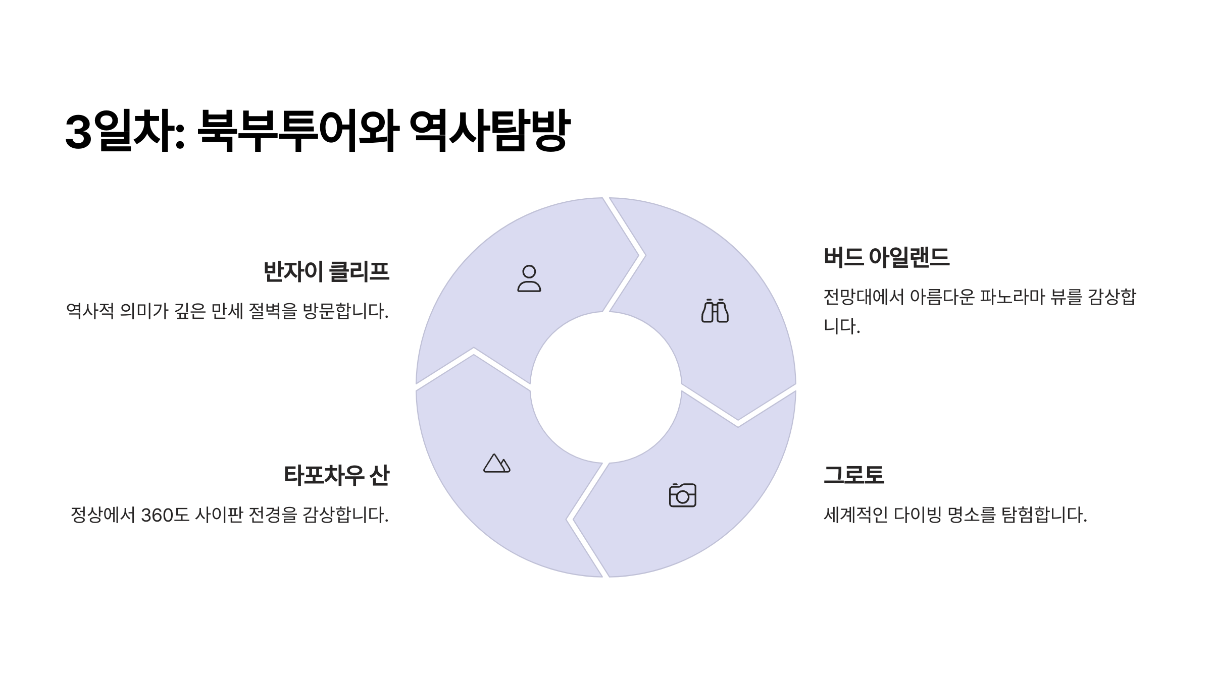 시간 일정 장소 08:00 북부투어 출발 가라판 08:30 그로토 탐방 그로토 10:00 사이판 전쟁기념관 방문 전쟁기념관 12:00 훕안 동굴 탐방 훕안 동굴 14:00 페르난도 알바레스 전망대 페르난도 알바레스 북부투어는 사이판의 다양한 문화와 역사를 배우고, 자연의 아름다움을 만끽할 수 있는 시간이에요. 중간중간 내려다보는 바다 경치가 정말 멋져서 가슴이 벅차오를 거예요! 그로토에서는 스노클링을 꼭 해보세요. 전통적인 사이판을 느낄 수 있는 이곳에서 여행의 또 다른 매력을 발견할 수 있어요 🌅