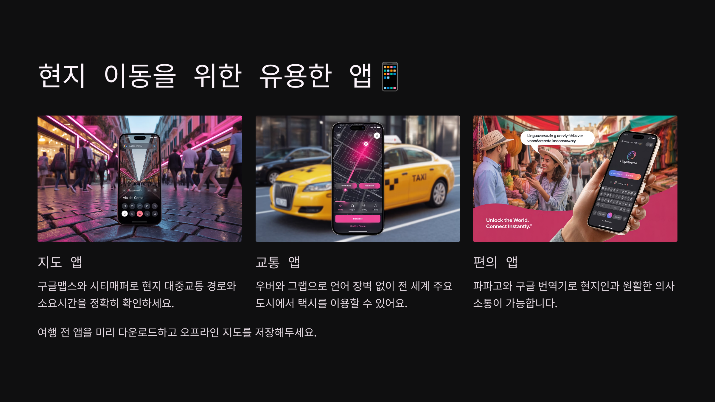 앱 기능 추천 여행지 Google Maps 경로 안내, 오프라인 지도 전 세계 Citymapper 대중교통 경로, 실시간 정보 도시 중심 Uber / Lyft 차량 공유 서비스 전 세계 Moovit 대중교통 실시간 정보 주요 도시 Maps.me 오프라인 지도 전 세계 이 앱들을 활용하면 현지에서의 이동이 훨씬 더 편리하고 빠르게 이뤄질 수 있어요. 게다가 대중교통을 잘 이용하면 여행 비용도 줄일 수 있으니, 다양한 앱을 사용해보세요. 여행의 여유를 더해주는 현명한 도구들이랍니다! 😎