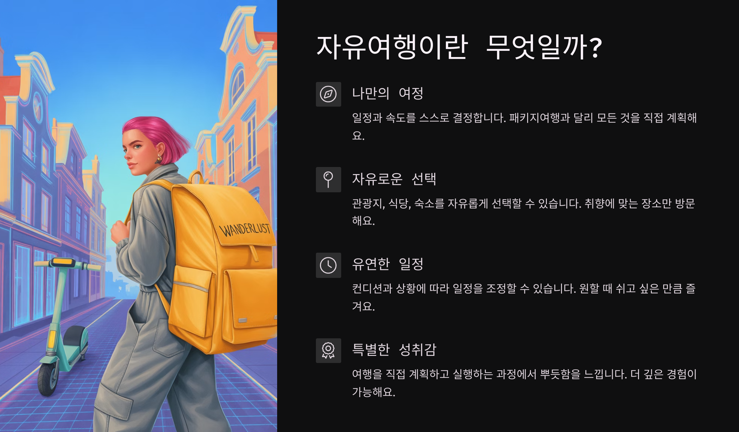자유여행은 말 그대로 정해진 패키지나 가이드 없이, 여행자가 스스로 일정을 계획하고 교통과 숙박을 예약해 떠나는 방식이에요. 예전에는 패키지여행이 대세였다면, 요즘은 자유로운 일정과 취향을 반영할 수 있는 자유여행이 대세죠.이런 여행 방식은 시간에 구애받지 않고, 자신이 가고 싶은 곳만 콕 집어 갈 수 있어서 더 깊이 있는 여행이 가능해요. 게다가 혼자든 친구랑 같이든 모두의 스타일에 맞게 유연하게 조정할 수 있는 장점이 있답니다.