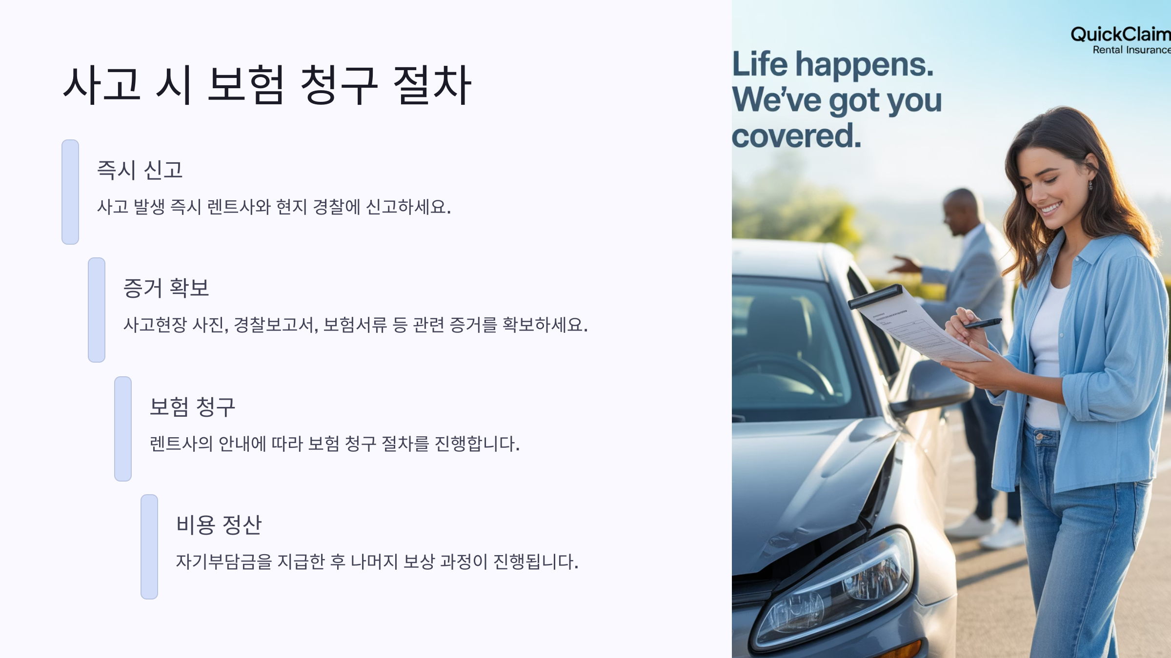 세 번째는 렌트카 회사에 즉시 연락하기! 지연 신고는 보험 거부 사유가 되기도 해요. 사고 상황을 정확히 설명하고, 보험 적용 가능 여부를 확인한 뒤 필요한 서류를 요청하면 돼요. 끝으로 보험사에도 신고서를 제출해 청구 절차를 시작하면 완료예요 😊