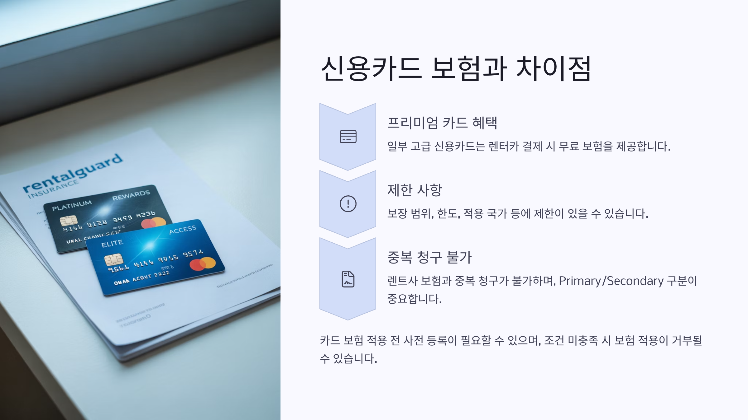 신용카드 보험은 '보조적인 보험'이라고 생각하고, 기본적인 책임보험과 SCDW 등은 따로 가입하는 걸 추천해요. 여행 중 스트레스 줄이고 싶은 분들에게는 이중 보장이 심리적 안정감을 주기도 하거든요.