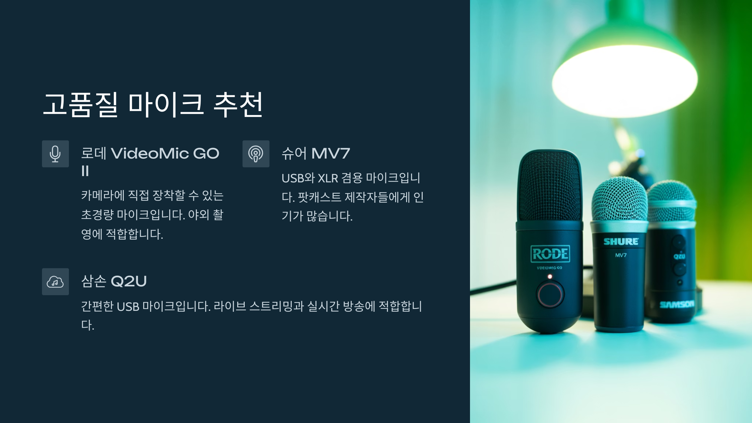 1인 크리에이터라면 슈어(SHURE) MV7 같은 USB 마이크나, 로데(RØDE) NT-USB Mini처럼 초보자 친화적이면서 음질 좋은 제품을 추천해요.