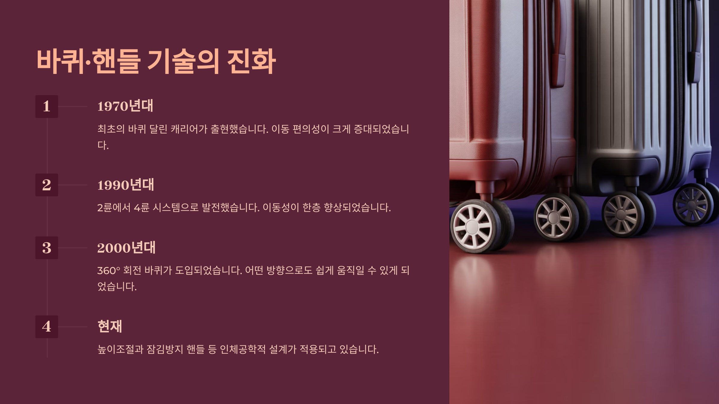 1990년대엔 2개의 바퀴에서 4바퀴(스피너)로 기술이 발전했어요. 이제는 수직으로 세워서 끌 수 있고, 방향 조절도 훨씬 쉬워졌죠. 저가 항공사들이 늘어나면서 경량화 소재를 적용한 모델들도 많이 나왔어요.