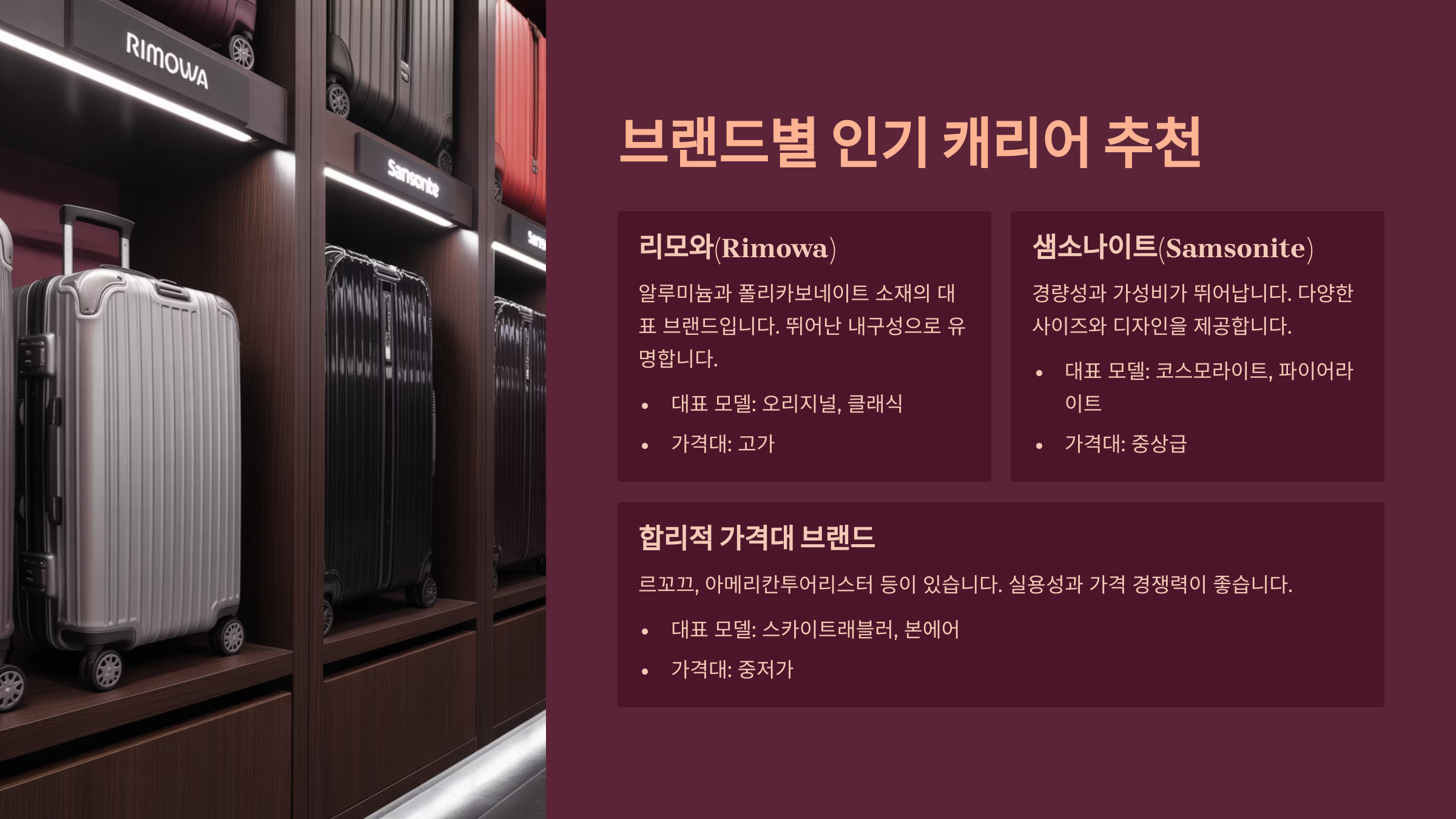 예를 들어 리모와는 알루미늄 캐리어의 상징 같은 브랜드로, 고급스러움과 내구성을 동시에 챙기고 싶다면 제격이에요. 반면 쌤소나이트는 실용성과 가성비를 갖춘 브랜드로, 출장이나 일상 여행에 널리 쓰여요.