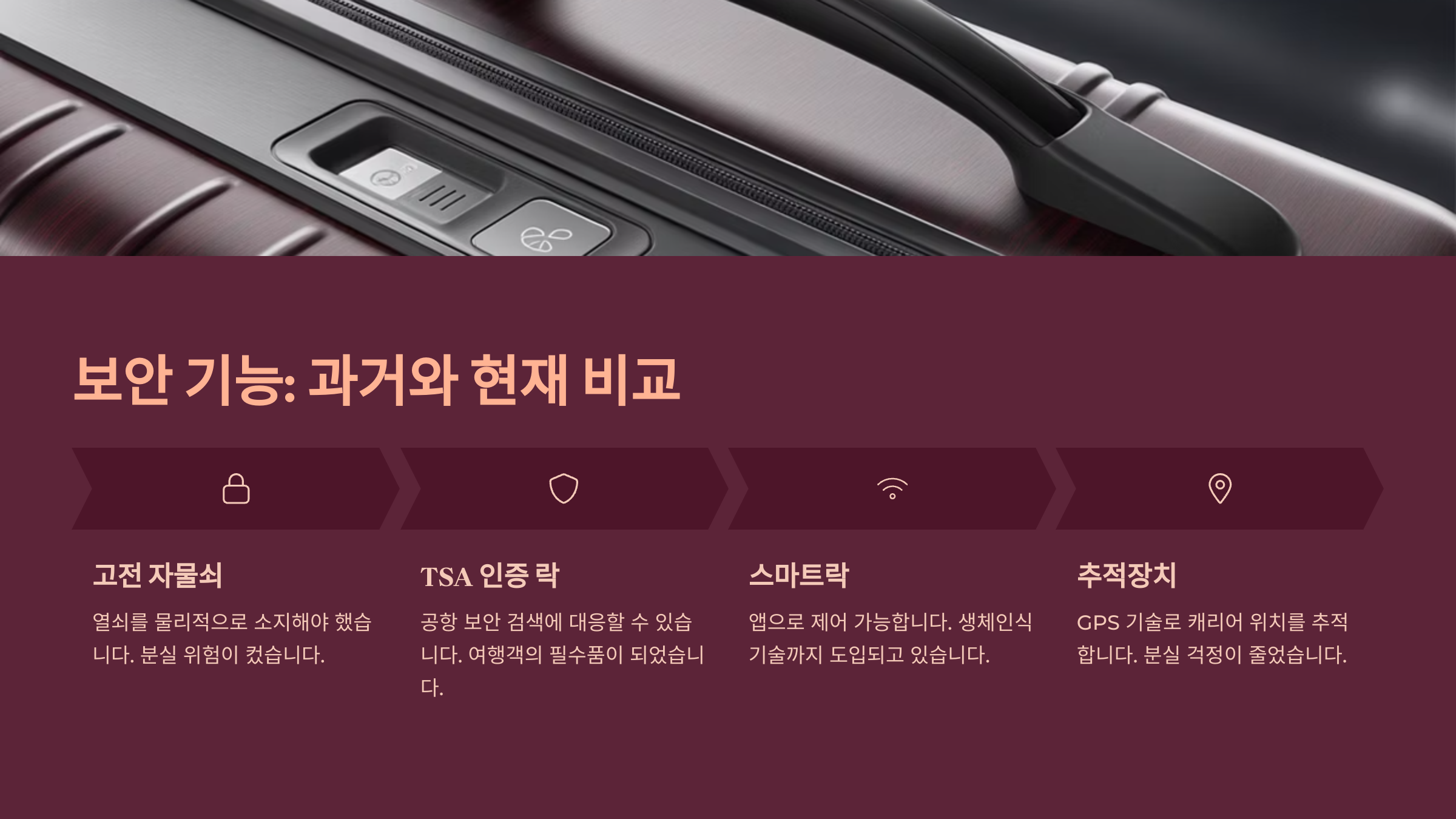 부품 기능 장점 추천 여행 스타일 2바퀴 한 방향 끌기 간단하고 저렴함 단거리, 경량 여행 4바퀴(스피너) 360도 회전 이동성 최고 공항, 도시 여행 우레탄 바퀴 내구성 + 정숙성 소음 적고 부드러움 장거리, 밤 이동 듀얼 핸들 흔들림 방지 안정적 조작감 중장비 무게 캐리어 이제 이동이 편해졌다면, 내 짐을 안전하게 지켜주는 '보안 기능'도 놓칠 수 없겠죠?
