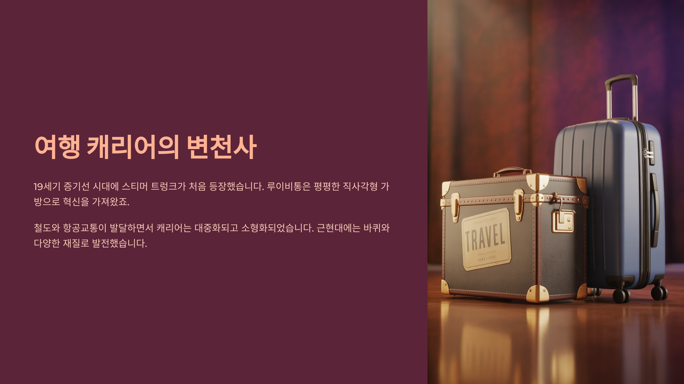 시대 주요 특징 대표 형태 소재 1900년대 초 무거움, 고정형 트렁크 가죽, 나무 1970~80년대 바퀴 부착 시작 휠 캐리어 합성섬유 2000년대 이후 경량화, 보안 향상 스피너형 폴리카보네이트, ABS 2020년대 스마트 기능 탑재 모듈형, 스마트캐리어 카본, 알루미늄 이제는 단순히 크기나 디자인만 볼 게 아니라, 시대별 특징과 기능성을 살펴보는 게 훨씬 똑똑한 선택이에요. 다음 섹션에서는 소재별로 어떤 캐리어가 좋은지 알아볼게요! 🚀