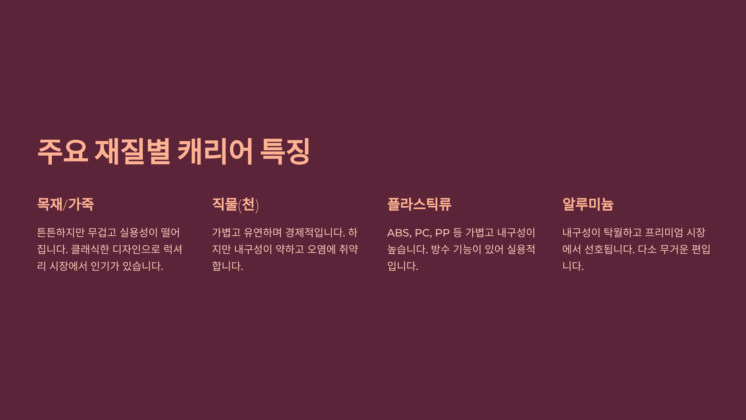 소재 장점 단점 추천 대상 ABS 저렴하고 가벼움 스크래치, 내구성 낮음 단기 여행자 폴리카보네이트 충격 흡수, 고강도 가격 다소 높음 장기 여행자 알루미늄 내구성 최고, 스타일리시 무겁고 비쌈 잦은 출장자 카본 초경량, 고강도 매우 고가 프리미엄 선호자 자, 재질의 차이를 파악했다면 다음은 '이동의 편리함'을 책임지는 바퀴와 핸들 기술로 넘어가 볼게요! 🛞