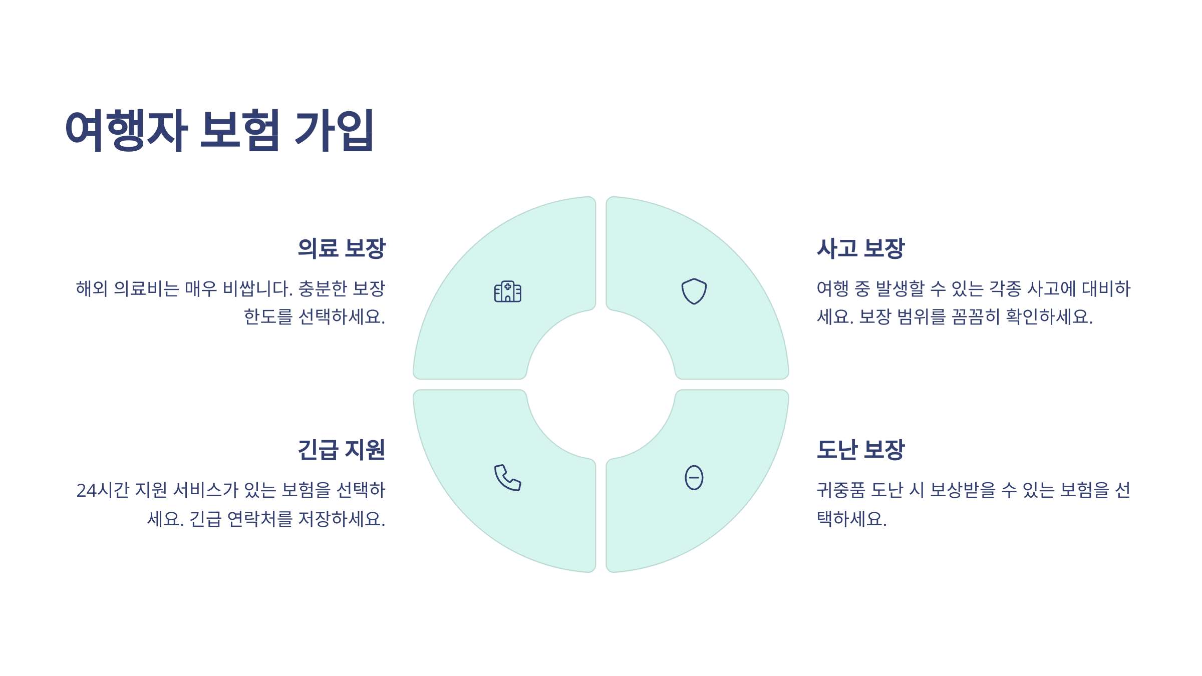 보장 항목 상세 설명 질병 및 상해 치료비 해외 병원비 보장 항공편 지연/결항 보장 추가 숙박비 지원 수하물 분실/파손 보장 수하물 피해 보상 배상 책임 타인 피해 시 배상 보험료는 저렴하지만, 사고 발생 시 큰 도움이 되니 꼭 가입하는 게 좋아요! 👍