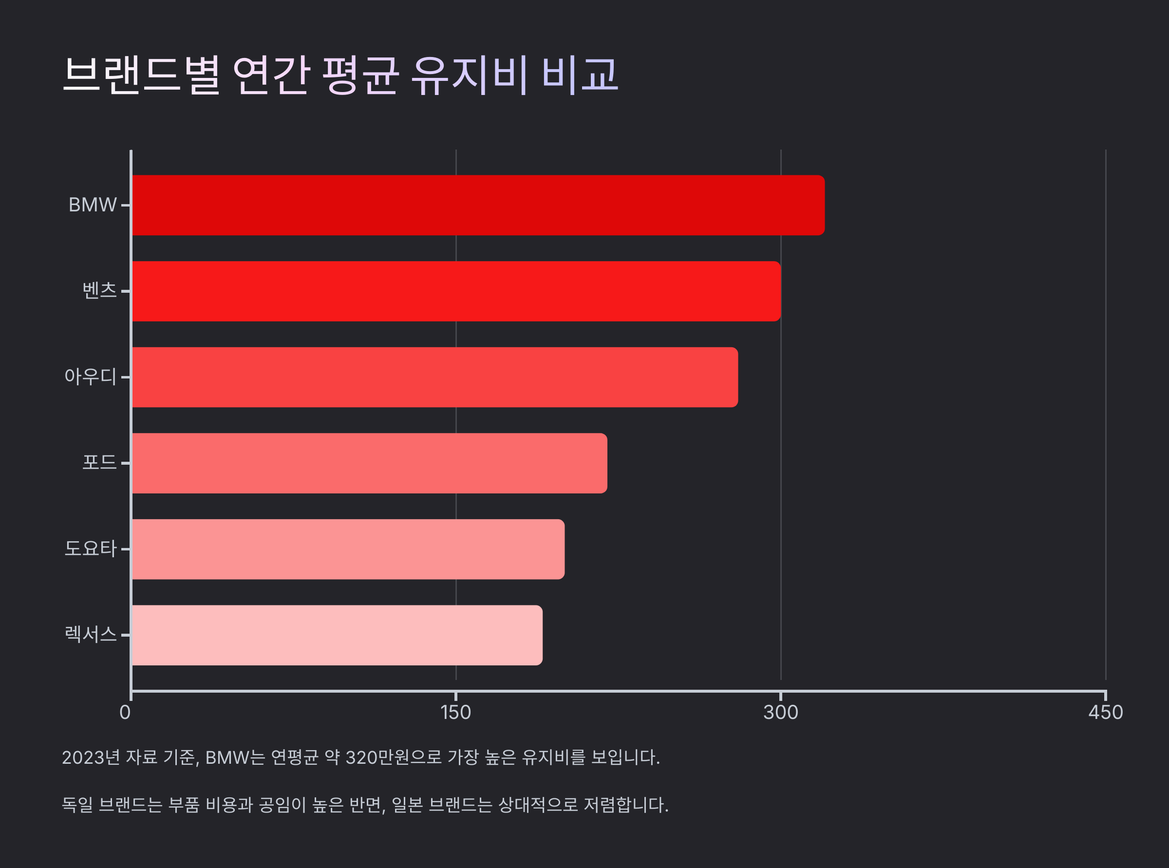 수입차는 브랜드에 따라 유지비가 크게 달라져요. 예를 들어 BMW, 벤츠, 아우디는 대표적인 ‘고유지비’ 브랜드로 연간 300~500만 원 수준이 일반적이에요.