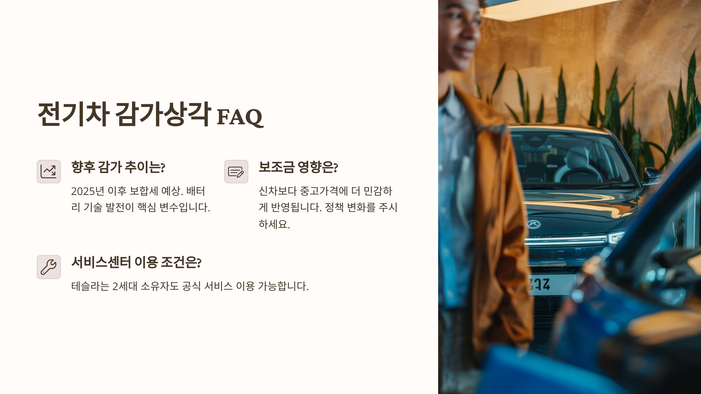 A2. 맞아요. 브랜드 이미지와 OTA 업데이트로 잔존가치가 높게 유지돼요.